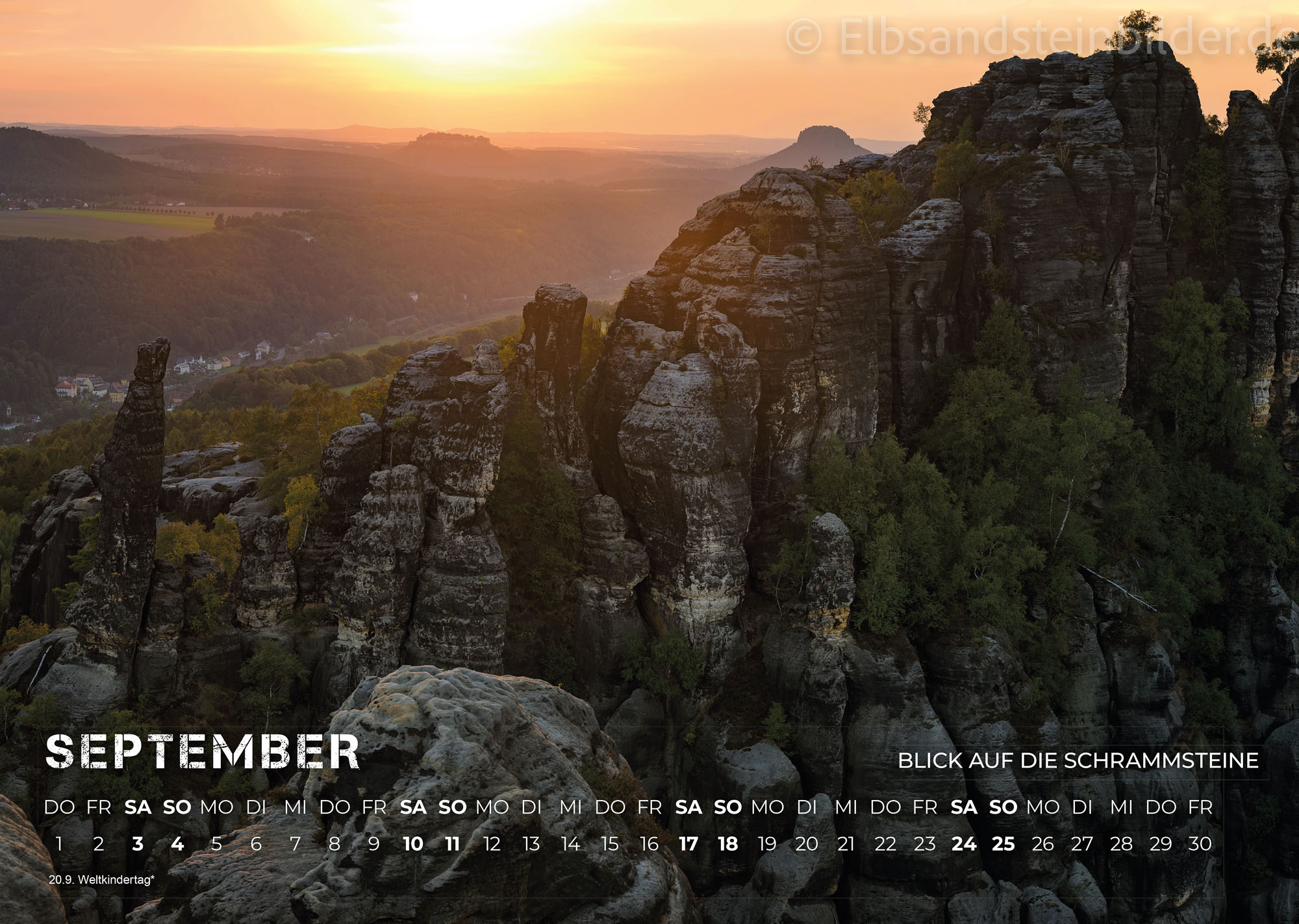 Im September gibt es einen Blick auf die Schrammsteine zu sehen. Wenn man genau hinschaut entdeckt man auf einigen Felsen graue Gipfelbuchkasetten. Diese Felsen tragen Namen wie „Tante“ und „Onkel“ und auch einen „Schwager“ gibt es hier zu sehen. Im Hintergrund sieht man wieder den Lilienstein und die Festung Königstein. Die Häuser weit unten im Tal gehören zu Krippen, einem Ortsteil von Bad Schandau.